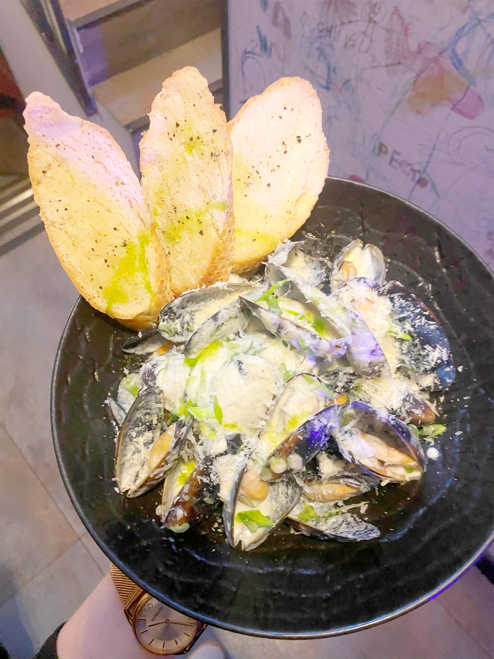 Разогреваем сковороду, добавляем чесночное масло, затем мидии, обжариваем.